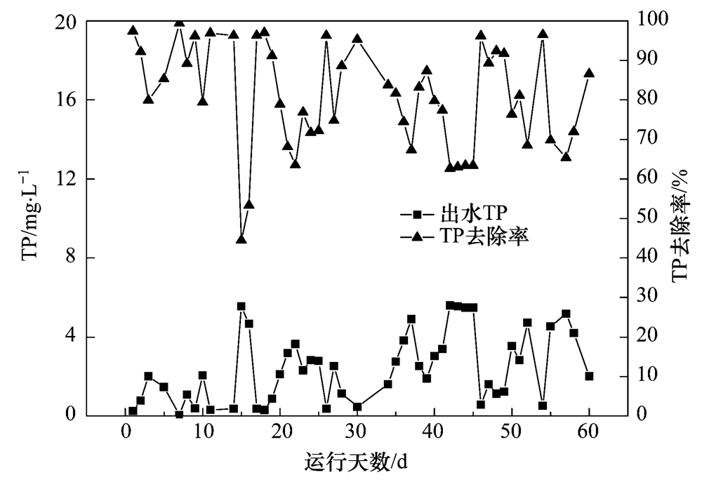 反應(yīng)器對(duì)TP的去除效果見圖 8. 從中可知,反應(yīng)器對(duì)TP去除效果波動(dòng)較大,去除率在44.50%~97.40%之間. 分析原因:一是改變運(yùn)行條件會(huì)有短暫的不適應(yīng),此時(shí)的除磷效果較差; 二是連續(xù)進(jìn)料使得部分TP未完全反應(yīng). 除14 d突然提高氮負(fù)荷造成系統(tǒng)短暫不適應(yīng)外,TP去除率可維持在60%以上.