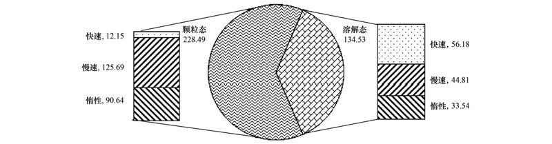 圖 3為溶解態(tài)COD及顆粒態(tài)COD中不同生物降解性碳源組分分析結(jié)果. 從中看出,溶解態(tài)COD占總COD的38.75%,其中快速降解有機(jī)物占41.76%,慢速降解有機(jī)物占33.31%,惰性有機(jī)物占24.93%. 而顆粒態(tài)COD中快速降解有機(jī)物只有5.32%,說(shuō)明顆粒態(tài)中快速易生物降解有機(jī)物很少,很可能是少量快速降解有機(jī)物吸附在顆粒表面所致. 顆粒態(tài)中慢速降解有機(jī)物占到55.01%,表明顆粒態(tài)有機(jī)物中絕大多數(shù)為慢速降解有機(jī)物. 另有39.67%比例為惰性有機(jī)物,可以發(fā)現(xiàn)顆粒態(tài)中有相當(dāng)比例有機(jī)物是難于降解的,這些物質(zhì)可能在一級(jí)處理中隨污泥排出一部分,在生物池活性污泥中吸附一部分,出水中惰性難降解有機(jī)物總量減少可以進(jìn)一步解釋這一現(xiàn)象[13]. 快速降解有機(jī)物中82.22%為溶解態(tài),17.78%為顆粒態(tài); 慢速降解有機(jī)物中有26.28%為溶解態(tài),73.72%為顆粒態(tài). 總體表明,快速生物降解有機(jī)物絕大部分以溶解態(tài)存在,而慢速生物降解有機(jī)物中大部分以顆粒態(tài)存在[14,15].