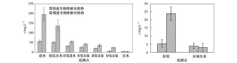 (2)快速與慢速生物降解有機(jī)物在生物系統(tǒng)中均沿程降低,慢速生物降解有機(jī)物在厭氧池、 缺氧池中分解轉(zhuǎn)化并被利用,其中厭氧池對(duì)慢速生物降解有機(jī)物的轉(zhuǎn)化效率最高,而好氧池對(duì)快速生物降解有機(jī)物的去除效果最為明顯,慢速生物降解有機(jī)物在好氧池中主要隨同活性污泥被沉淀去除.
