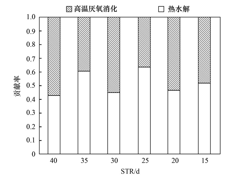 熱水解和高溫厭氧消化對總VSS去除的貢獻見圖 6. 由圖可知,當高溫厭氧消化的SRT為15 d、 20 d、 25 d、 30 d、 35 d和40 d時,熱水解的貢獻比例分別為51.92%、 46.45%、 63.52%、 44.77%、 60.66%和42.68%,而厭氧消化的貢獻比例分別為48.08%、 53.55%、 36.48%、 55.23%、 39.34%和57.32%,表明熱水解和高溫厭氧消化去除VSS的貢獻大致相當. 盡管熱水解的SRT只有3 d,僅占總SRT的6.98%~16.67%,但對總VSS去除率的貢獻明顯.
