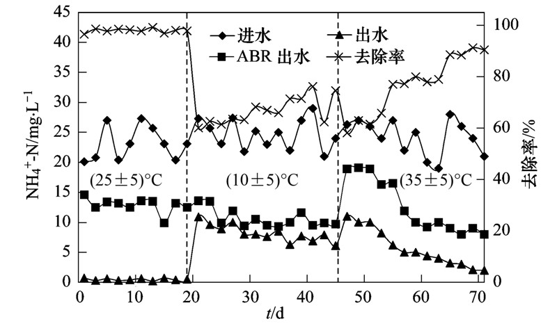 整個試驗過程中進水COD為260~330 mg ·L-1,COD隨時間變化的去除效果如圖 2所示. 中溫階段,ABR對COD去除率達60%,其出水COD濃度低于112 mg ·L-1. CAMBR對COD的去除率達到90%以上,系統出水COD濃度低于26 mg ·L-1. 當溫度降低至低溫階段,ABR對COD的去除效果驟降,COD去除率僅有40%,出水濃度高達166 mg ·L-1,系統對COD的去除能力也顯著降低,COD去除率僅有66%,出水濃度高達90 mg ·L-1,這與溫度的驟降導致微生物活性降低,其生長代謝能力減弱有關[8]. 隨著反應器的運行,微生物逐漸適應了環境溫度的變化,系統對COD的去除效果有所好轉并趨于穩定,最終穩定在89%左右,出水濃度在31 mg ·L-1左右. 當溫度突然升高到35℃,由于微生物沒有適應環境溫度的突變,ABR對COD的去除效果顯著降低,其出水COD濃度高達160 mg ·L-1,系統對COD的去除率也僅有75%,出水濃度達到了75 mg ·L-1. 隨著微生物對環境的適應,ABR對COD的去除效果逐漸增強,系統對COD的去除能力也逐漸增強并趨于穩定,最終COD平均去除率穩定在90%,出水平均濃度為28 mg ·L-1. 由試驗可知,CAMBR對溫度變化的適應能力較強,并能較快地恢復有機物去除能力.