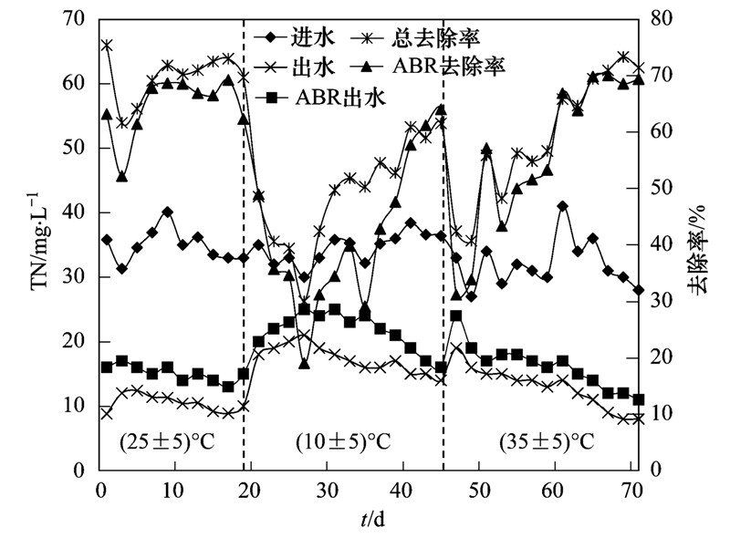 由于溫度的驟升,高溫階段初期隨NH+4-N轉化率的驟降,系統TN去除效果明顯降低,TN去除率僅有40%,出水TN濃度高達19 mg ·L-1. 隨著反應器的運行,微生物對溫度的驟變逐漸適應,NH+4-N轉化率逐漸提高,系統出水TN去除率也逐步提高,最終升高至70%左右,出水濃度為9 mg ·L-1左右,其中,ABR對TN的去除率達60%.