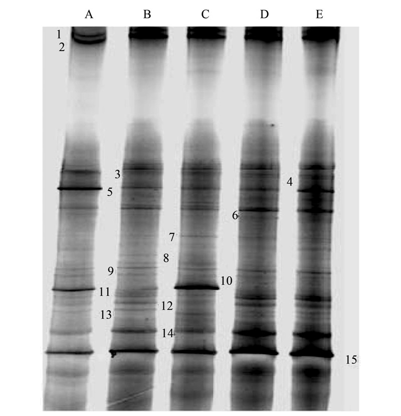 A. ABR1; B. ABR2; C. ABR3; D. 好氧池; E. 膜池 圖 7 第102 d不同隔室污泥樣品的DGGE凝膠圖譜