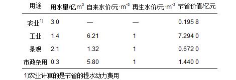 (1)再生水的資源效益 由于再生水回用于沖廁,綠化等用途,節省了相當量的自來水; 用于農業灌溉,則提供了肥料. 這部分效益可用式(1)計算: