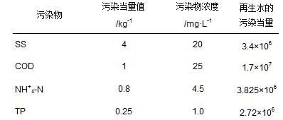 污水排放減少導致的收益可以通過計算相應減少的排污費來代替. 按照我國實行的排污費征收辦法[13],對向水體排放污染物的,按照排放污染物的種類、 數量以污染當量計征污水排污費,每一污染當量征收標準[式(2)中的φi]為0.7元. 排放污染物的污染當量值參照環保部規定(表 2),馮運玲等[19]對北京的再生水廠進行了調查,確定了出水中污染物的濃度[式(2)中的ρi,見表 3],于是再生水中各種污染物的污染當量[式(2)中的ni]就可以相應地獲得. 在征收污水排污費時按污染當量數從多到少的順序取其前3項,故對本研究來說,只考慮SS、 COD和NH+4-N. 根據式(3)得出減少污水排放的收益是0.339億元.