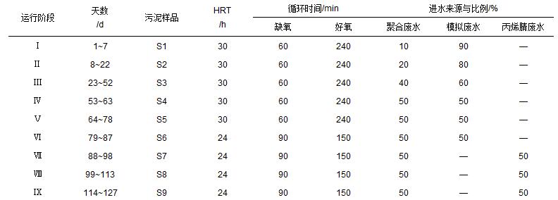 反應(yīng)器采用逐漸增加實際廢水比例的方式運行,根據(jù)運行條件和進水水質(zhì)的不同,整個運行期可以分為9個階段,各階段污泥樣品分別標記為S1~S9.反應(yīng)器的運行條件見表 1.