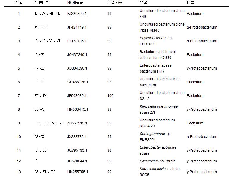 對DGGE指紋圖譜的條帶進行回收測序分析,將測序結(jié)果與NCBI(National Center for Biotechnology Information,USA)數(shù)據(jù)庫中已知序列進行比對,確定各微生物的同源性及種屬,檢測到的微生物及其相關(guān)信息如表 3所示.經(jīng)比對鑒定,在SBMBR的9個污泥樣品中共檢測到22種微生物,其相似度大多在98%以上,其中屬于變形菌Proteobacterium的微生物有12種,分別屬于α綱(5種)和γ綱(7種),其余10種屬于未分類的Bacterium.