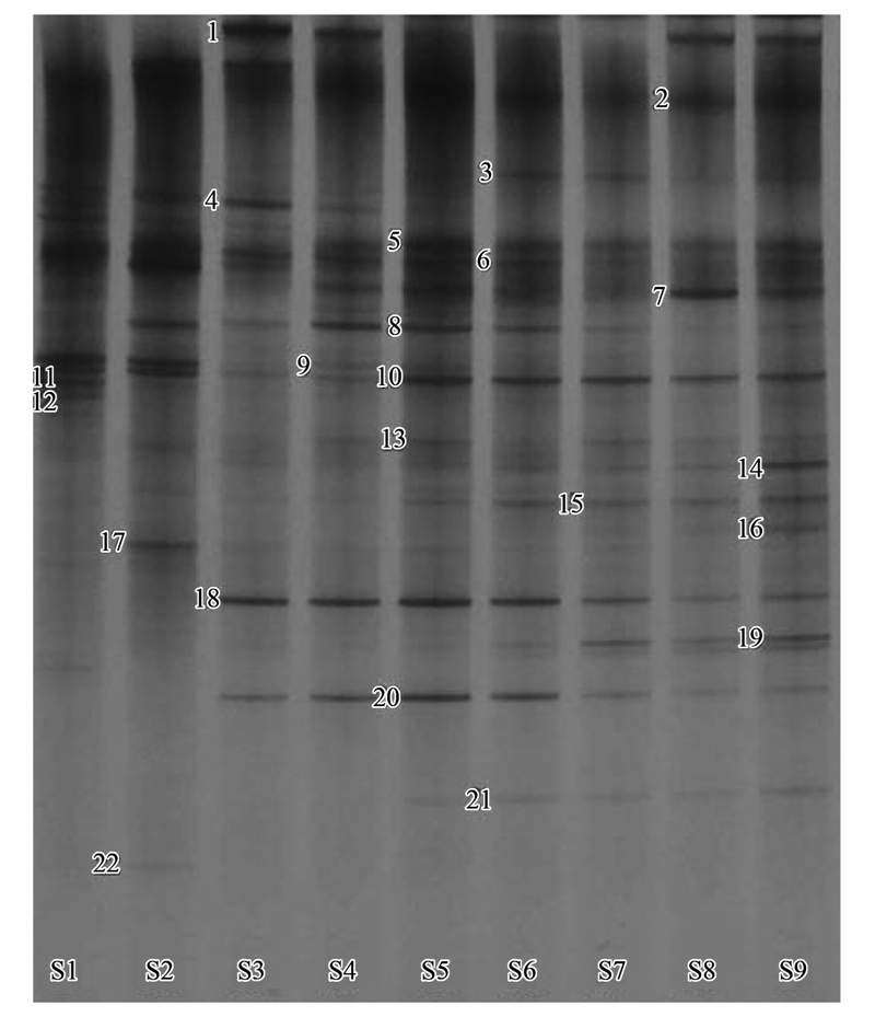 反應(yīng)器運行各階段污泥樣品總細菌的DGGE指紋圖譜見圖 3.從中可以看出,在反應(yīng)器連續(xù)運行的9個階段,各階段污泥樣品的電泳條帶數(shù)目、 條帶強度和條帶遷移速率均存在一定的差異,SBMBR系統(tǒng)中微生物種群呈現(xiàn)出較為明顯的演替變化.在反應(yīng)器運行的初始階段(Ⅰ和Ⅱ),污泥的培養(yǎng)馴化還未完成,污泥樣品的條帶數(shù)目較少,說明微生物種群結(jié)構(gòu)較為簡單.隨著實際廢水比例的不斷增加和污泥的馴化,污泥樣品的條帶數(shù)目開始逐漸增多,條帶分布也較為均勻,說明微生物種群組成開始變得更加豐富,反應(yīng)器的穩(wěn)定性也在不斷增強.從S7開始,由于采用了實際丙烯腈廢水代替之前的模擬廢水,進水水質(zhì)發(fā)生了明顯的變化,微生物種群結(jié)構(gòu)也發(fā)生了較為明顯的變化,部分菌種(如18和20)的條帶強度略有降低,并產(chǎn)生了一些新的條帶(如7、 14和19),說明不適應(yīng)進水水質(zhì)的微生物群落優(yōu)勢度降低,降解實際廢水中污染物的新菌群逐步建立并形成為優(yōu)勢菌種.S9樣品泳道中條帶較為豐富、 均勻度較好,說明反應(yīng)器經(jīng)過一個階段的運行后,微生物群落逐漸豐富并達到一個穩(wěn)定的狀態(tài).