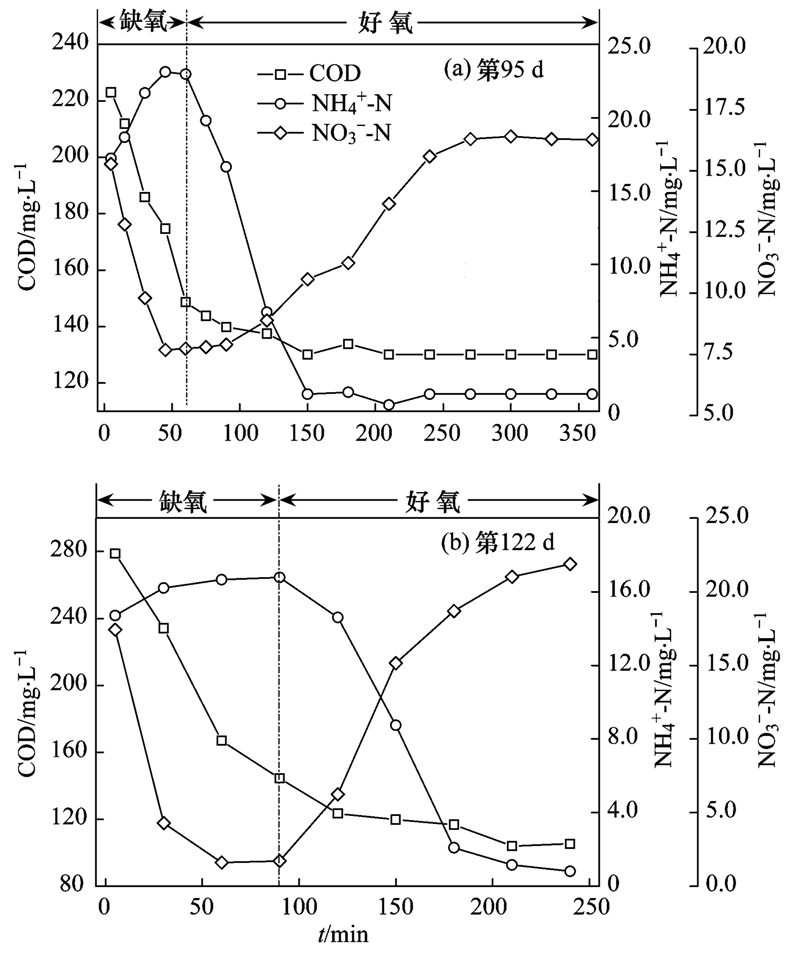 序批式生物反應(yīng)器通過間歇曝氣的方式在反應(yīng)器運行中實現(xiàn)缺氧/好氧的交替循環(huán),最終通過硝化/反硝化過程實現(xiàn)有機物和氮的去除,因此,合理的運行周期不僅可以提高生化系統(tǒng)的處理效果,還能降低能耗和運行成本[23].在反應(yīng)器運行的Ⅰ到Ⅶ階段,SBMBR的周期運行方式為60 min缺氧/300 min好氧,該條件下單個運行周期內(nèi)COD、 NH+4-N、 NO-3-N的變化如圖 2(a)所示,可以看出,COD的降解和NO-3-N的去除主要發(fā)生的缺氧攪拌期(0~60 min),這是因為在缺氧條件下,異養(yǎng)型的反硝化細菌以廢水中有機物為營養(yǎng)物質(zhì),通過反硝化過程實現(xiàn)N的去除[24].此外,在缺氧攪拌過程中,系統(tǒng)中NH+4-N的濃度逐漸升高,這主要是廢水中有機氮在微生物作用下向NH+4-N轉(zhuǎn)化導(dǎo)致的.在好氧階段(60~360 min),經(jīng)過約90 min的曝氣,NH+4-N濃度迅速降低至1.0 mg ·L-1左右,NO-3-N的濃度逐漸升高并在在曝氣210 min左右時基本達到最大并穩(wěn)定.為了提高反應(yīng)系統(tǒng)對污染物的降解能力,減少過度曝氣帶來的能耗損失,從第99 d開始,調(diào)整SBMBR的運行周期為90 min缺氧/150 min好氧,由圖 2(b)可以看出,在該運行條件下,COD和NH+4-N都能夠在最經(jīng)濟的條件下得到有效的去除,出水可以穩(wěn)定達標排放.