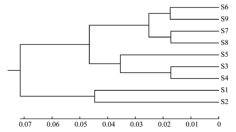 采用非加權(quán)配對算術(shù)平均法(UPGMA)對微生物群落結(jié)構(gòu)相似性作聚類分析,結(jié)果如圖 4所示.從中可以看出,9個樣品的微生物群落可以分成3大族群,樣品1、 2為一個族群,樣品3、 4、 5為一個族群,樣品6、 7、 8、 9為一個較大的族群,這說明隨著反應(yīng)器運行條件的不同和進水水質(zhì)的變化,污泥微生物群落結(jié)構(gòu)發(fā)生了一定程度的變化.在完全采用實際廢水處理后,污泥樣品的群落結(jié)構(gòu)與之前采用部分模擬廢水時的群落結(jié)構(gòu)存在較為明顯的變化.