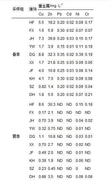 春季采樣組中豬場(chǎng)沼液的重金屬檢出濃度最高,6種重金屬在10家豬場(chǎng)沼液中都有檢出. 銅和鋅的濃度分別為0.82~8.8 mg ·L-1和1.4~39.8 mg ·L-1,所有豬場(chǎng)均超過(guò)《畜禽養(yǎng)殖業(yè)水污染物排放標(biāo)準(zhǔn)》(征求意見(jiàn)稿)中規(guī)定的銅(0.5 mg ·L-1)和鋅(1.5 mg ·L-1)排放限值. 鉛濃度在0.15~0.35 mg ·L-1之間,鎳和鉻的濃度相差不大,分別為0.07~0.15 mg ·L-1和0.04~0.21 mg ·L-1,6種重金屬中鎘的濃度最低,為0.01~0.03 mg ·L-1. 關(guān)于豬場(chǎng)豬糞中重金屬含量的報(bào)道中,Cu和Zn的含量也是最高的.