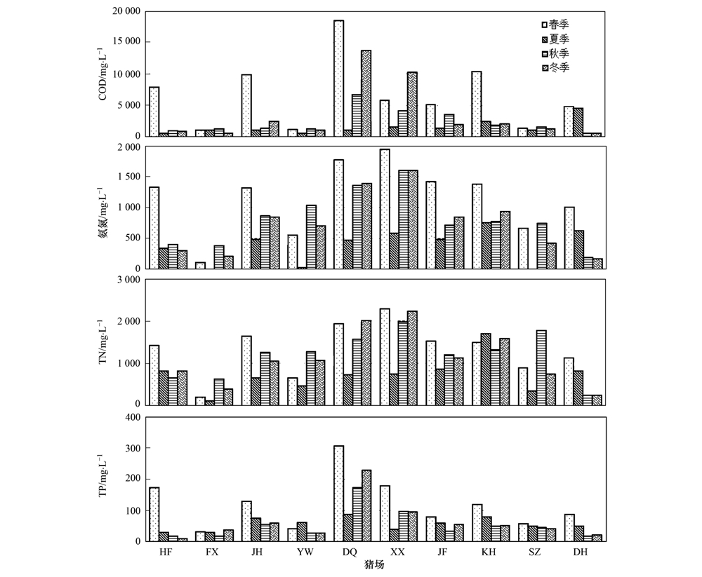 圖 1 春夏秋冬4次采樣中10家規(guī)模化豬場(chǎng)COD、 氨氮、 TN和TP的濃度變化情況