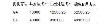 圖 5為GA與SA遺傳代數與目標函數優化收斂對比. GA在40代后優化目標函數趨于收斂,而SA在20代后趨于穩定. GA在前20代目標函數優化波動性比SA要大. 兩者最終都趨于穩定. 兩種優化方法識別決策變量的最佳組合. 在最小化治理成本下,全局優化井數、 井的抽水量、 安裝成本、 抽水處理成本,使得優化結果可信. SA的系統治理成本要比GA少3338.45元,節省成本約6.8%,見表 5具體參見污水寶商城資料或http://www.bnynw.com更多相關技術文檔。