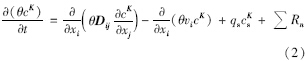 式中,Kx、 Ky、 Kz分別為滲透系數在x、 x、 y方向的分量; h表示水頭(m); qs表示單位時間從單位體積含水層流入或流出的水量(d-1); Ss表示貯水率(m-1); t表示時間(d). MT3DMS地下水溶質運移方程: