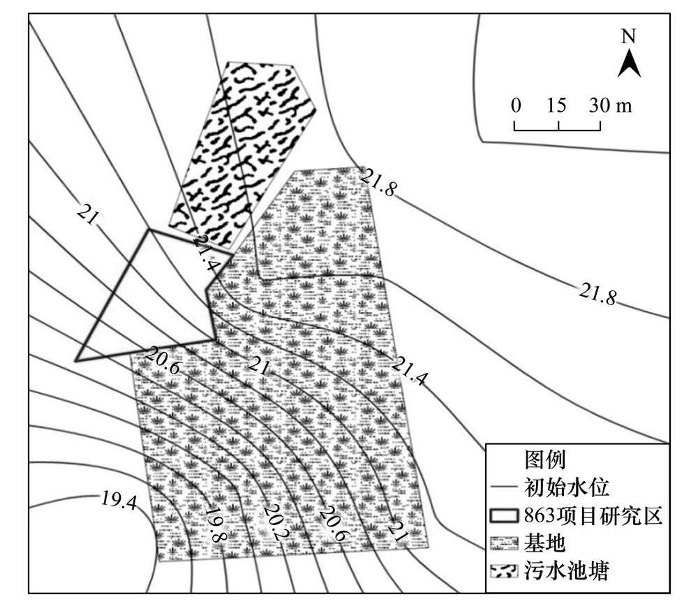 研究區位于北京某場地,所處區域地勢平坦. 場地東側為養殖場,西南側為當地農民耕作農田,農村垃圾和畜禽養殖廢水均排放到池塘(圖 1).