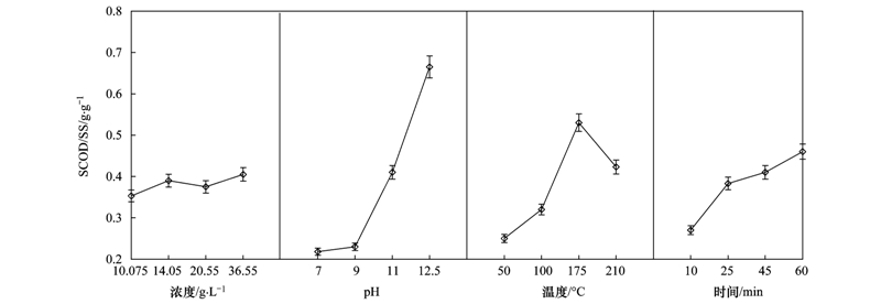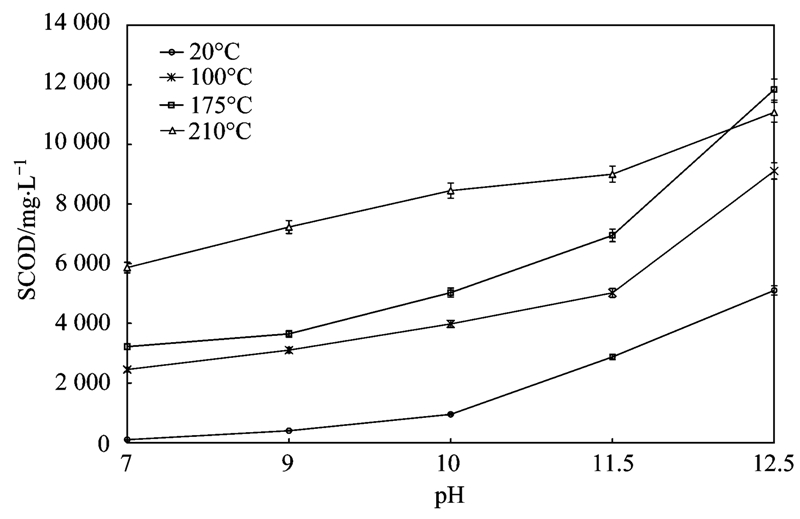 為了驗(yàn)證正交試驗(yàn)得出的單位污泥SCOD隨溫度和pH的變化趨勢(shì),進(jìn)行如下驗(yàn)證試驗(yàn):采用8 mol ·L-1 NaOH分別將污泥pH調(diào)節(jié)為6.9±0.1、 9.0±0.1、 10±0.1、 11.5±0.1、 12.5±0.1,并穩(wěn)定5 min. 再將上述5種不同pH值污泥分別置于20、 100、 175及210℃處理60 min,冷卻后進(jìn)行相關(guān)分析,各做3組平行試驗(yàn). 1.3 分析方法