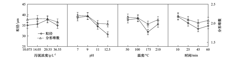 熱堿處理能破壞污泥絮體結(jié)構(gòu),改變污泥表觀形態(tài),減小污泥粒徑,并提高污泥的ξ電位,從而影響污泥的形態(tài)特征[25]. 污泥形態(tài)特征可以用粒徑和分形維數(shù)表示. 分形維數(shù)是一個(gè)很重要的參數(shù),它影響了絮體的密度,分形維數(shù)的提高說明污泥絮體由松散型向致密型過渡[26]. 采用激光粒度儀測(cè)定污泥粒徑,并根據(jù)光散射法計(jì)算污泥絮體的分形維數(shù),試驗(yàn)結(jié)果如表 2所示,其極差及方差分析見表 5. 從中可知,粒徑及分形維數(shù)的極差大小均為:pH>溫度>時(shí)間>污泥濃度. 結(jié)合方差分析結(jié)果可知,這4個(gè)因素對(duì)污泥粒徑的影響是顯著的,顯著性順序?yàn)椋簆H>溫度>時(shí)間>污泥濃度. 而只有pH值對(duì)分形維數(shù)的影響是顯著性的,其它3個(gè)因素均不顯著.