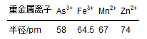 縱觀MPGM對4種重金屬離子的吸附規(guī)律,吸附效率由高到低依次為Zn>Mn>Fe>As. 其中,重金屬離子競爭吸附是不可避免的,如:①當重金屬離子具有相同的核電荷數(shù)時,半徑大的離子可在pH低的情況下優(yōu)先吸附; ②對于相同電荷的重金屬離子,吸附效率高低依次為二價金屬:Zn2+>Mn2+,三價金屬:Fe3+>As3+; ③競爭吸附與重金屬離子半徑相關,4種重金屬離子半徑可參見表 3. 在電荷效應的影響下,會使MPGM活性位的電子云發(fā)生變化而更易吸引重金屬離子,其由于重金屬離子的靜電斥力而具有離解趨勢. 半徑較大的重金屬離子的極化率大,變形性也大,而水分子本身也有很大的變形性,會使它們之間發(fā)生附加極化效應,其結果會促使原有的配位鍵過渡到共價鍵,增大MPGM對半徑較大的重金屬離子的吸附能力[27, 28].