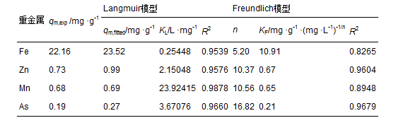 子表現(xiàn)出較強的表面單層化學吸附[29],驗證了MPGM脫附再利用部分的分析. 從表 5中可以發(fā)現(xiàn),MPGM吸附Fe、 Zn、 Mn、 As這4種重金屬離子的最大吸附量(qm,fitted)參數(shù)分別為23.52、 0.99、 0.69及0.21 mg ·g-1與實驗的平衡吸附量(qe,exp)變化趨勢一致,說明MPGM對4種重金屬離子吸附能力的順序依次為Fe>Zn>Mn>As.