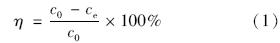 式中,η為各重金屬離子的吸附效率,%; c0為石英純化廢水中各重金屬離子的初始濃度,mg ·L-1; ce為吸附后各重金屬離子的殘留濃度,mg ·L-1.