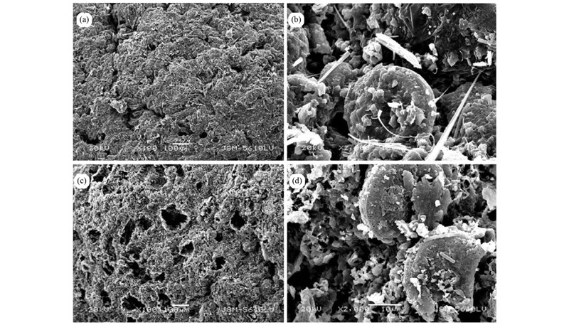 (a)、 (b)均為未焙燒樣品,其中(a)為外表面,×100,(b)為橫斷面,×2000; (c)、 (d)為850℃焙燒3 h樣品,其中(c)為外表面,×100,(d)為橫斷面,×2000 圖 2 MPGM的SEM圖像