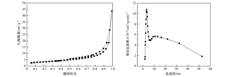 從表 2中可知,MPGM具有多孔性、 低散失性,且抗壓強度及比表面積均較大等特點. 其中,低散失率(0.74%)和高抗壓強度(2.53 MPa)特性對再生利用極為有利. 如圖 1所示,按照IUPAC分類[21],MPGM的N2吸附-脫附等溫線為Ⅲ型,表明待測樣品主要存在較多的介孔(孔徑范圍為2~50 nm)及少部分的大孔(孔徑大于50 nm的孔)[22],且在3.5 nm附近呈現(xiàn)一個寬度較窄的尖峰,有利于特性吸附. 另外,在0.50~0.95的高壓區(qū)域存在H4型回滯環(huán),與層狀礦物堆積形成的狹縫型孔有關.