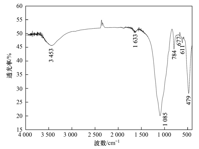 MPGM官能團分析是利用美國Nicolet公司的IS-10型傅立葉變換紅外光譜儀進行測試分析(如圖 3). 波數(shù)3453 cm-1 處為水分子中羥基的對稱伸縮振動特征吸收峰; 1633 cm-1為水分子H—O—H彎曲振動特征吸收峰,1085 cm-1和784 cm-1 分別為材料中Si—O—Si的對稱伸縮振動和彎曲振動特征吸收峰; 677 cm-1為材料中Si—O—Al的伸縮振動特征吸收峰; 611 cm-1和479 cm-1 分別對應的是Si—O—AlVI彎曲振動和Si—O—Fe伸縮振動特征吸收峰[25, 26]. 綜上可知,MPGM官能團以層狀硅酸鹽礦物的基團為主且Fe元素含量較高.