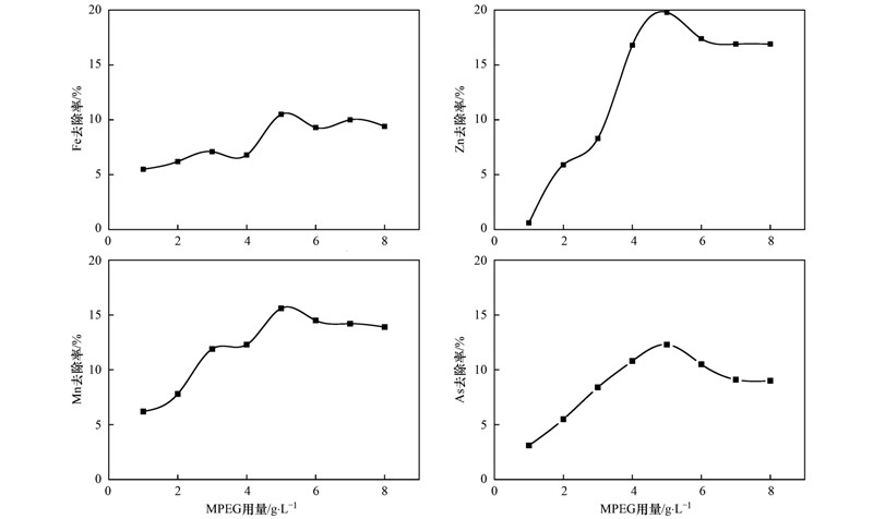 由圖 4可知,隨著MPGM用量從1.0 g ·L-1增加到8.0 g ·L-1時,對各重金屬離子的吸附效率整體呈上升趨勢. 當?shù)陀?.0 g ·L-1時,隨吸附劑用量增加,F(xiàn)e、 Mn、 As、 Zn的去除率明顯上升,Zn和Mn的尤為顯著,而由于MPGM中Fe元素含量較高,因此Fe的去除率呈緩慢、 波動式上升; 當MPGM用量約為5.0 g ·L-1時,4種重金屬離子的去除效率均達最高值,而后MPGM對4種離子的吸附效率略有下降; 當用量超過6.0 g ·L-1時,該值趨于平衡. 究其原因,極有可能是因為石英純化廢水的污染物成分復雜,不同于實驗室模擬的單一污染物體系,因此MPGM的表面效應、 孔道效應、 離子交換效應、 水合效應、 納米效應等協(xié)同或抑制作用亦較為復雜,而當MPGM用量為5.0 g ·L-1時前述效應的協(xié)同作用對4種重金屬離子的去除達到一個最優(yōu)組合,因此均出現(xiàn)去除率的最大值.