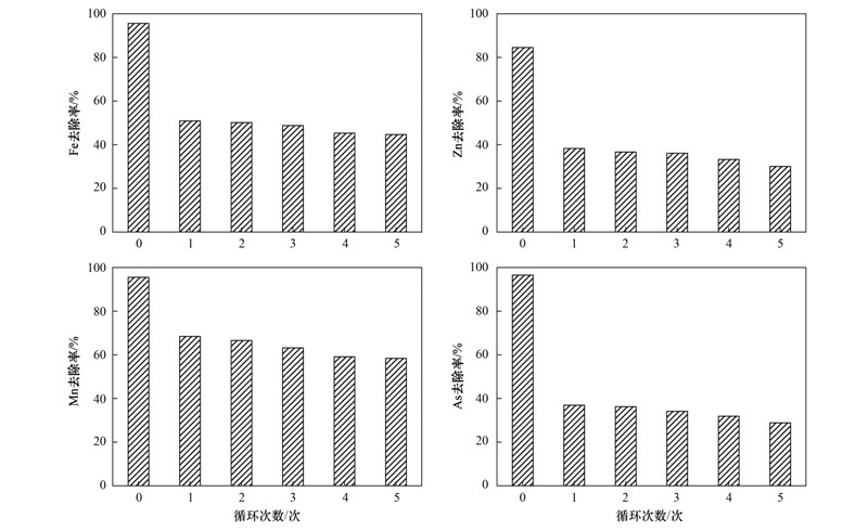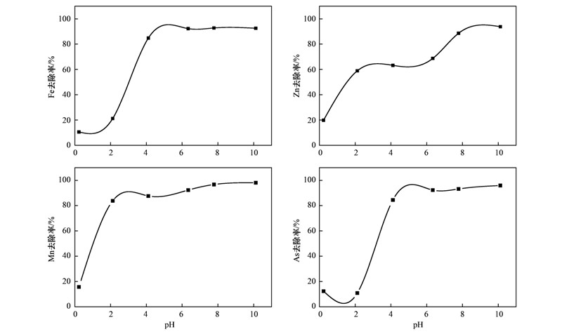由圖 5看出:①酸性條件下,MPGM對重金屬離子的吸附效率隨廢水初始pH的升高而逐漸增大; ②當pH在6.0~8.0之間時,研究體系中Mn、 Fe及As趨于吸附平衡,去除效率從高到低依次為Mn>Fe>As; ③Zn離子在pH 4.0與pH 10.0附近時出現(xiàn)兩個吸附平衡點. 這是由于Zn(OH)2屬于兩性氫氧化物所決定的,且高pH值時Zn的去除有較大提升,揭示了在復雜的重金屬離子污染體系中,強堿性條件下生成的高配位體ZnO2-2更有利于MPGM吸附凈化.