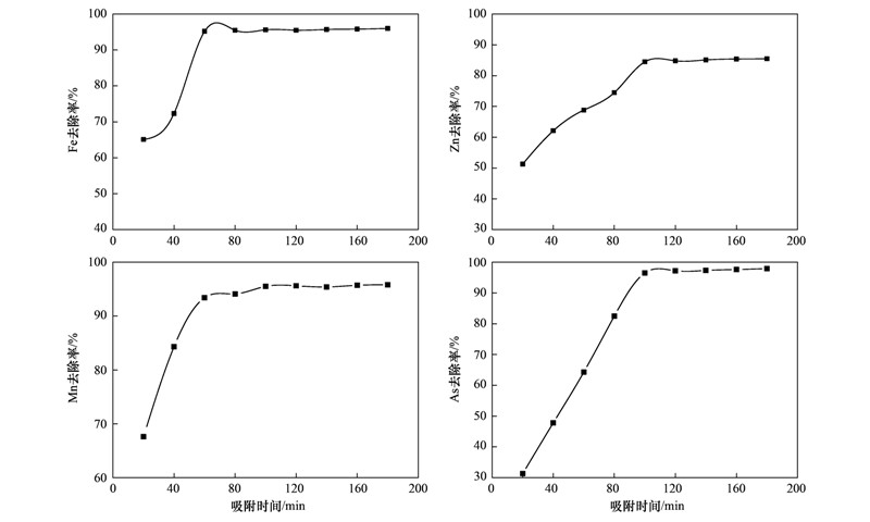 吸附時間對石英純化廢水中重金屬離子去除的影響(調(diào)節(jié)反應時間分別為20、 40、 60、 80、 100、 120、 140、 160 min). 結果如圖 6所示.