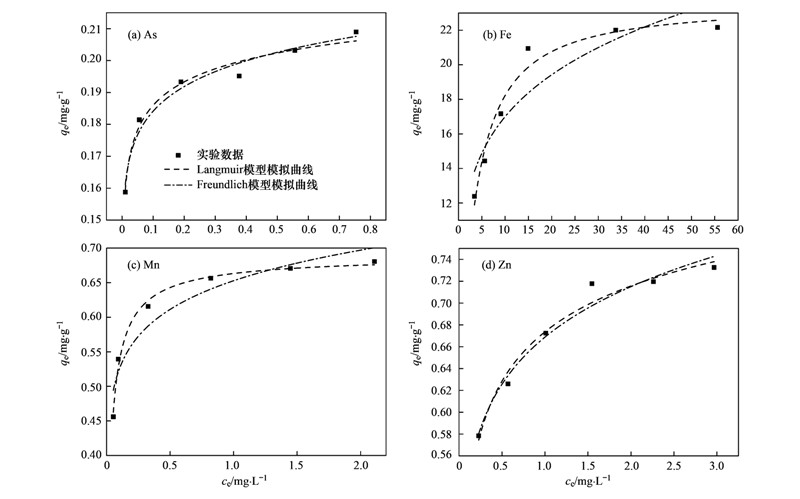 由圖 7可知,脫附再利用1次后MPGM對石英純化廢水中Fe、 Zn、 Mn、 As的去除率下降幅度較大,而之后的循環(huán)利用效率略有下降,主要是4種金屬離子與MPGM之間存在較強的化學吸附作用,1.0 mol ·L-1的NaCl溶液很難將其完全脫附. MPGM循環(huán)利用吸附4種重金屬離子效率依次為Mn>Fe>Zn>As,基本符合離子半徑大小與離子濃度高低順序. 脫附方法、 效率與機制還有待深入研究. 2.7 吸附等溫線分析
