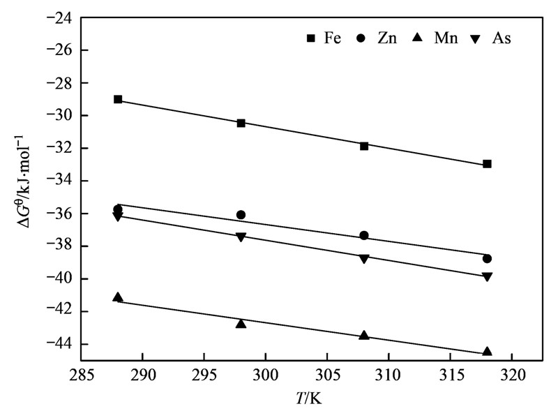 實際上,石英純化廢水中重金屬離子的理化性質(zhì)各異、 初始濃度不同,用一兩個吸附動力學表達式很難客觀描述所有重金屬離子的吸附速率. 因此對不同特性重金屬離子應當有不同的吸附動力學表達式. 建立復雜體系多金屬吸附動力學表達式的相關研究另文報道. 2.9 吸附熱力學