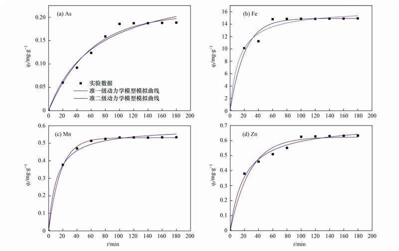 由圖 6可知,MPGM吸附石英純化廢水中4種重金屬離子隨吸附時間增加而上升,但吸附速率和 平衡吸附效率各有差異. 在反應的前80 min內(nèi),吸附速度快,吸附效率迅速上升; Fe、 Mn在80 min后吸附逐漸趨于平衡,而Zn、 As則需要100 min. 這與離子半徑和離子濃度是相關的.
