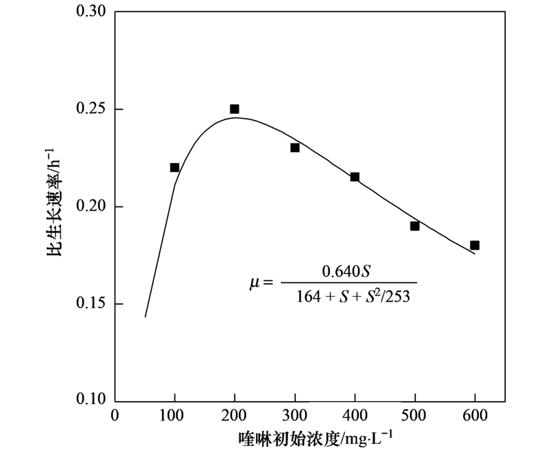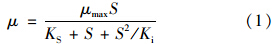 式中,μ為細胞比生長速率(h-1); μmax為細胞最大比生長速率(h-1); S為限制性底物質量濃度(mg ·L-1); KS為半飽和系數(mg ·L-1); Ki為底物抑制系數(mg ·L-1),Ki越高則反映底物抑制作用越不明顯.