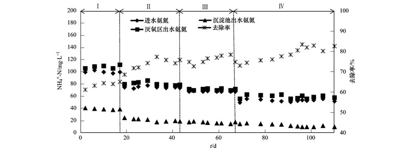 整個運行期間,厭氧區對氨氮幾乎沒有去除作用,且氨氮濃度有所升高,而在好氧區NH+4-N被大量去除(圖 3). 第Ⅰ階段,氨氮去除率就達到60%以上并最終穩定在65%左右. 第Ⅱ、 Ⅲ階段由于絮狀污泥被洗脫,氨氮去除率有所波動,但總體呈上升趨勢. 進入第Ⅳ階段,因顆粒污泥的形成并通過增強曝氣,系統對NH+4-N的整體去除率穩定在80%以上,表明顆粒污泥的形成強化了NH+4-N去除效果.