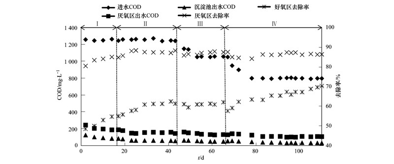 第Ⅰ(整體啟動)階段沉淀池HRT為2.0 h,厭氧區COD容積負荷在2.1 kg ·(m3 ·d)-1左右,厭氧污泥經過17 d的馴化,出水COD穩定在200 mg ·L-1左右,去除率維持在80%以上,充分說明ABR中接種的厭氧顆粒污泥具有良好COD去除能力. 由于處于啟動初期,好氧區的COD去除率較低,僅為55%左右,出水COD濃度為85 mg ·L-1左右; 第Ⅱ階段沉淀池HRT為1.5 h,由圖 2可知,厭氧區對COD的去除率逐漸升高,出水COD在150 mg ·L-1左右. 厭氧區各個隔室內上向流速由0.087 m ·h-1提高至0.115 m ·h-1,增進了厭氧污泥與進水基質的充分接觸,因而強化了對底物的去除能力. 系統中的好氧活性污泥經過啟動期的適應,已有少量顆粒污泥出現,但此時系統中仍以絮狀污泥為主,絮狀污泥的傳質阻力較低因而有利于對營養物質的吸收降解,COD去除率略有升高,穩定在60%左右,沉淀池出水COD逐漸降低至60 mg ·L-1左右; 第Ⅲ階段進一步縮短沉淀池HRT至1.0 h,對應厭氧區HRT縮短至7.11 h,逐漸調整進水COD濃度至1 050 mg ·L-1,厭氧區COD去除率經歷短暫波動后又恢復至先前較高水平,出水COD濃度在135 mg ·L-1左右. 當沉淀時間縮短至1.0 h時[此時沉淀池的表面負荷達到1.4 m3 ·(m2 ·h)-1],大量的絮狀污泥被淘洗出系統,好氧區內生物量在短期內大量減少,但同時,反應器內的顆粒污泥不斷生長,生物量增加,對底物的去除率提高并維持在60%以上; 第Ⅳ階段沉降時間為0.75 h、 好氧區COD容積負荷為2.0 kg ·(m3 ·d)-1,經過一個月的運行,好氧段的COD去除率穩定在70%以上,出水濃度穩定在40 mg ·L-1以下,而整個系統的COD 總去除率達90%以上. 可見,實現污泥顆粒化之后,系統COD的去除率越來越穩定,表明污泥顆粒化反應器具有較好的處理效能.