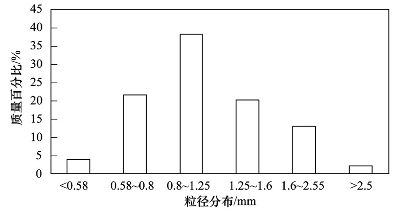 本研究中沉淀池HRT逐步從2.0 h降為0.75 h,反應器中污泥形態發生了明顯變化,即由Ⅰ階段的灰褐色絮狀污泥[圖 5(a)]逐漸轉變為Ⅱ階段時肉眼可見的微小聚集體,此時的聚集體邊緣較為毛糙、 表面存在較多絲狀體[圖 5(b)]; Ⅲ階段好氧區內大量絮狀污泥被洗脫出反應器,淡黃色污泥聚集體數量大幅上升,具有了規則、 光滑的顆粒邊緣,粒徑主要分布在0.58~1.25 mm的范圍內[圖 5(c)]; 進入Ⅳ階段,顆粒尺寸進一步增大,結構更加密實,邊緣更加清晰,呈現較為規則的圓形或橢圓形[圖 5(d)]. 圖 6為第108 d時好氧區內顆粒污泥的粒徑分布,粒徑在小于0.58 mm、 0.58~0.8 mm、 0.8~1.25 mm、 1.25~1.6 mm、 1.6~2.5 mm及大于2.5 mm范圍的顆粒污泥所占總污泥質量的百分比分別為4.2%、 21.67%、 38.28%、 20.37%、 13.12%及2.36%,即反應器中粒徑大于0.58 mm的污泥成絕對優勢(占95%以上),表明好氧區內已成功實現污泥的顆粒化.