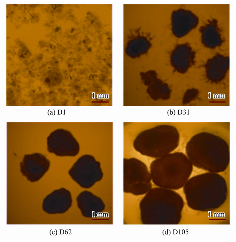 通過縮短沉淀時間(即縮短沉淀區HRT),致使沉降性能較差的分散污泥不斷被洗出. 以好氧區內污泥形態變化為依據,將整個培養過程分為階段Ⅰ(整體啟動)、 階段Ⅱ(顆粒初顯)、 階段Ⅲ(顆粒生長)以及階段Ⅳ(顆粒成熟). 對污泥進行鏡檢分析表明,系統運行17 d后,污泥的形態發生明顯變化,由原來的絮狀污泥逐步向結構較為松散、 肉眼可見表面較多絲狀體的微小聚集體轉變,此后至第110 d逐步相互黏合成長為結構較為密實,邊緣更加清晰的淡黃色好氧顆粒污泥,成功實現了污泥顆粒化.