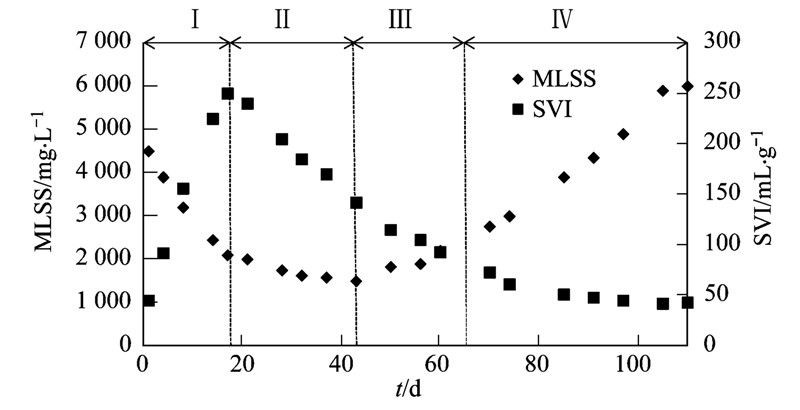 研究過程中,好氧區中污泥的SVI和MLSS的變化情況如圖 7所示. Ⅰ階段,接種的絮狀活性污泥沉降性能良好(SVI為45 mL ·g-1),隨后SVI不斷上升,Ⅰ階段末達到250 mL ·g-1,而此時在鏡檢中也發現了大量的絲狀菌,說明在連續流式運行下,即使采用不易產生絲狀菌的乙酸鈉為碳源,但其基質濃度梯度幾乎為零的特征也很容易產生絲狀菌膨脹的情況[14]. 隨著選擇壓的不斷增強,SVI逐漸降低,最終穩定在45 mL ·g-1以下. 另一方面,MLSS則經歷了先下降再上升的過程,隨著沉淀時間的不斷縮短,沉降性能差的、 細小的絮體污泥被不斷地淘洗出反應器,沉降性能較好的污泥則被截留在反應器內,MLSS由Ⅰ階段時的4 500 mg ·L-1降至Ⅱ階段末的1 500 mg ·L-1,此時顆粒污泥已初步形成. 本研究中進水的COD容積負荷由1.5 kg ·(m3 ·d)-1逐漸提高至2.0 kg ·(m3 ·d)-1,隨著污泥的不斷洗脫,好氧區中的污泥負荷由0.33 kg ·d-1提高至1.33 kg ·d-1,促進了顆粒污泥的形成. 與絮狀活性污泥相比,顆粒污泥具有較高的傳質阻力,而較高的COD容積負荷則有助于顆粒污泥克服其傳質阻力,但也容易引發絲狀菌污泥膨脹,因而此時控制好氧區在較高的水力剪切力下運行,使絲狀菌易于被沖刷出系統. 顆粒污泥形成之后,污泥濃度不斷升高,構成的晶核不斷吸附菌群,使顆粒越來越大,并在水力剪切力的作用下,顆粒變得越來越密實,其污泥濃度由1 500 mg ·L-1上升至6 000 mg ·L-1. 此時(第110 d)顆粒污泥呈現出非常好的沉降性能,其平均沉降速率為20.8 m ·h-1.