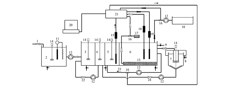 1.模擬城市污水; 2.污水箱; 3.厭氧段; 4.預缺氧段; 5.主缺氧段; 6.好氧段; 7.沉淀池; 8.出水; 9.剩余污泥排放; 10.NaHCO3溶液貯池; 11.溫度自動調節裝置; 12.蠕動泵; 13.空氣擴散器; 14. 電動磁力攪拌器; 15.ORP在線測定儀; 16.電動調節閥; 17.空氣壓縮機; 18.DO在線測定儀; 19.pH在線測定儀; 20.計算機; 21.可編程邏輯控制器; 22.混合液內循環; 23.硝化液內循環; 24.污泥回流圖