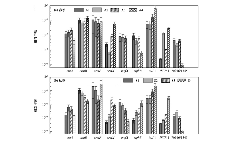 利用熒光定量PCR的方法檢測了大環(huán)內(nèi)酯類抗性基因ermB、 ermF、 ermX、 mefA、 ereA、 mphB和轉(zhuǎn)移元件ISCR1、 intI1、 Tn916/1545在4個(gè)污水處理單元中不同季節(jié)的分布特征和變化情況(圖 2). 從圖 2(a)中可知,春季進(jìn)水中抗性基因和轉(zhuǎn)移元件的濃度范圍為4.53×105~3.39×107 copies ·mL-1,二沉池出水中抗性基因的濃度范圍為0~7.53×106 copies ·mL-1,污水處理對抗性基因ermB、 ermF、 mefA、 ereA、 mphB和轉(zhuǎn)移元件Tn916/1545都有一定的去除效果,削減范圍為0.4~6 logs,抗性基因和轉(zhuǎn)移元件的削減效果依次為mefA>Tn916/1545> mphB> ereA> ermF>ermB,其中mefA在二沉池出水中未檢出,去除了6 logs,去除效果最好; 而ermX、 intI1、 ISCR1不但沒有被去除,反而出現(xiàn)了反彈. 如圖 2(b)中所示,秋季進(jìn)水中抗性基因和轉(zhuǎn)移元件的含量范圍為 4.17×104~2.95×107 copies ·mL-1,二沉池出水中抗性基因和轉(zhuǎn)移元件的含量范圍為1.86×103~8.19×106 copies ·mL-1,抗性基因ermB、 ermF、 mefA、 ereA、 mphB和轉(zhuǎn)移元件Tn916/1545有一定的去除效果,出水中下降了0.55~2.1 logs,其中mefA去除效果較好,下降了2.1 logs,而ermX、 intI1、 ISCR1出現(xiàn)了反彈.