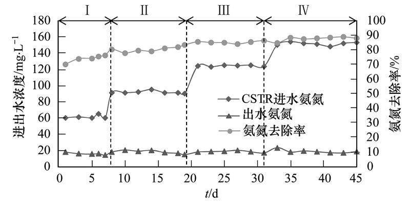 階段Ⅰ,亞硝酸鹽積累率在低于40%的范圍內劇烈波動,硝化類型以全程硝化為主. 進入階段Ⅱ,好氧區進水氨氮容積負荷提高至1.34 kg ·(m3 ·d)-1,全程硝化逐漸向短程硝化轉變(圖 3). 當進水氨氮濃度和負荷分別至120 mg ·L-1和1.79 kg ·(m3 ·d)-1時(階段Ⅲ),出水亞硝酸鹽積累率進一步提高至70%以上. 階段Ⅳ,提高氨氮容積負荷至2.23 kg ·(m3 ·d)-1,出水亞硝酸鹽積累率逐漸趨于穩定并接近80%,且氨氮去除率接近90%,即好氧區實現良好的亞硝化效果.