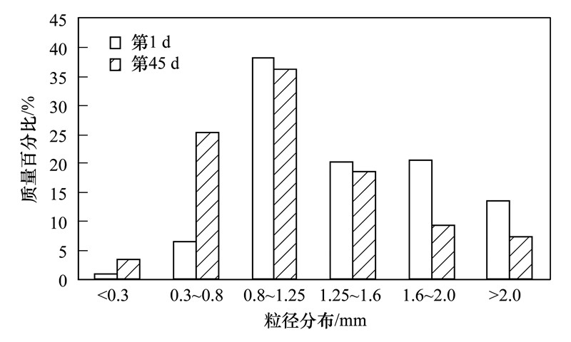 好氧區接種的污泥為實驗室ABR-CSTR一體化工藝中培養成熟的好氧顆粒污泥,外觀為淡黃色,呈現較為規則的圓形或橢圓形[圖 6(a)]. 系統運行初期,好氧區不斷產生絮狀污泥,部分顆粒污泥發生解體現象,第Ⅰ階段出水SS在波動中不斷上升,一度高達180 mg ·L-1(圖 7); 此時好氧區顆粒污泥完整性發生明顯惡化,邊緣毛糙、 表面存在較多絲狀體[圖 6(b)]; 此外,Ⅰ階段顆粒污泥沉降性能也變差(圖 8),平均沉降速度由接種時的40.6 m ·h-1下降至21.9 m ·h-1. Ⅱ階段,出水SS略有減少,但仍然在60 mg ·L-1以上,污泥解體現象稍有好轉但依然存在. 進入Ⅲ階段以后,出水SS與平均沉降速率均得到大幅改善. 實驗尾期,出水SS低于20 mg ·L-1,且平均沉降速率達到50 m ·h-1以上,顆粒污泥呈現黃色,結構密實、 邊緣清晰[圖 6(d)],粒徑>1.6 mm及粒徑<0.8 mm的顆粒較接種前分別減少和增加(圖 9). 而粒徑大小與氮損之間有重要聯系,粒徑減小,其內部缺(厭)氧區域比例相對減小,則反硝化程度減弱. 本研究中粒徑變化規律與圖 5所示氮損變化規律一致.