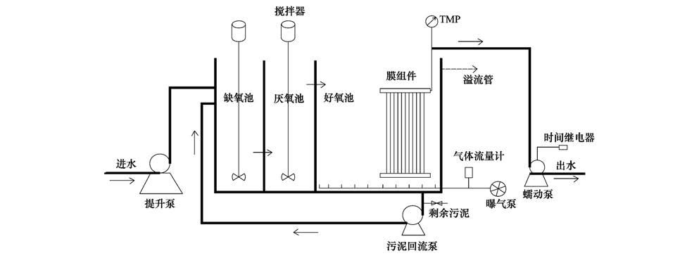 隨著城鎮(zhèn)污水處理廠提標(biāo)改造計劃的實施,常規(guī)A2/O工藝難以滿足《城鎮(zhèn)污水處理廠污染物排放標(biāo)準(zhǔn)》(GB 18918-2002)中一級A標(biāo)準(zhǔn)的要求. 膜生物反應(yīng)器MBR具有HRT短、 產(chǎn)泥少、 出水水質(zhì)好等優(yōu)點[8, 9, 10],膜的高效截留作用能使世代時間較長的菌種有足夠的生長時間,反應(yīng)器內(nèi)能保持較高的污泥濃度,不僅提高處理效果,同時能減少污泥的產(chǎn)生量、 節(jié)省大筆污泥處理費用.