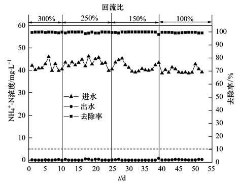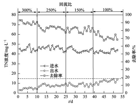 由圖 3可知,該工藝出水氨氮穩(wěn)定在0.01到1.12,低于《城鎮(zhèn)污水處理廠污染物排放標(biāo)準(zhǔn)》(GB 18918-2002)中一級A標(biāo)準(zhǔn),去除率達(dá)98.7%以上,一方面由于好氧池后段膜池曝氣量大,有機(jī)負(fù)荷低,有利于自養(yǎng)硝化菌的生長,另外,膜的高效截留使得世代時間較長的硝化細(xì)菌不流失,從而硝化效果好[14]. 圖 4中從左到右四段回流比分別為300%、 250%、 150%、 100%,總氮平均去除率分別為90.23%、 82.92%、 80.6%、 71.46%. 混合液回流至缺氧池向反硝化過程提供硝態(tài)氮,作為反硝化過程的電子受體,以達(dá)到脫氮的目的. 回流比越大,回流至缺氧區(qū)的硝酸鹽量增加,可供反硝化的硝氮越多,反硝化比率提高,系統(tǒng)TN去除率也相應(yīng)提高. 系統(tǒng)設(shè)計中缺氧區(qū)前置,反硝化碳源優(yōu)先得到滿足,提高了系統(tǒng)整體脫氮能力.