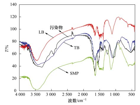 FTIR技術(shù)是表征有機(jī)物官能團(tuán)結(jié)構(gòu)的有力手段[20, 21],為了表征膜池微生物代謝產(chǎn)物對膜污染的影響,對膜池內(nèi)溶解性微生物代謝產(chǎn)物(SMP)、 胞外聚合物(EPS包括LB、 TB),及膜表面污染物分別進(jìn)行FTIR分析,結(jié)果如圖 8所示.