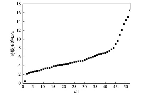 整個實驗過程未對膜進(jìn)行任何清洗,從圖 7可知,系統(tǒng)在運行的52 d里,TMP在前2 d內(nèi)增加明顯,從0.5 kPa突然增加到2.4 kPa,膜污染速率較高,這是因為系統(tǒng)在過濾初期,污泥混合液中顆粒在膜表面吸附,引起膜孔堵塞,形成了膜的初始污染[17, 18],因此TMP增長較快. 隨著膜孔堵塞繼續(xù)發(fā)展,在隨后的40 d內(nèi)TMP從2.4 kPa增長到8 kPa,膜污染速率為5.83 Pa ·h-1,此階段為膜的緩慢污染階段[9]. 在此階段內(nèi),污染物不僅在膜孔內(nèi)吸附,且吸附發(fā)生在整個膜表面,污泥混合液中的生物絮體在膜表面開始形成濾餅層,但此時的濾餅層對TMP的增長影響較小,TMP增長緩慢. 在反應(yīng)器運行的最后10d里,TMP從8 kPa驟增到16.5 kPa,膜污染速率為35.42 Pa ·h-1,系統(tǒng)發(fā)生嚴(yán)重膜污染.