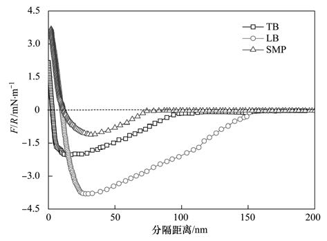 圖 9為PVDF微顆粒探針測定的反應(yīng)器內(nèi)3種微生物代謝產(chǎn)物與自制復(fù)合膜之間的典型黏附力曲線圖,縱坐標(biāo)采用F/R(黏附力與微顆粒半徑的比值),從而消除探針PVDF顆粒半徑不同產(chǎn)生的影響. 由圖 9可知,微生物代謝產(chǎn)物與自制復(fù)合膜之間的黏附力大小順序為LB>TB>SMP,其黏附力的大小分別為3.55、 2.11和1.12 mN ·m-1,從而確定LB為膜主要污染物,與FTIR分析結(jié)果一致.具體參見污水寶商城資料或http://www.bnynw.com更多相關(guān)技術(shù)文檔。