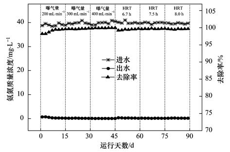 實(shí)驗(yàn)分為對(duì)曝氣量和HRT的優(yōu)化兩個(gè)部分,每個(gè)部分又分為3個(gè)階段,各階段采用不同的曝氣量或HRT,連續(xù)運(yùn)行15 d,總計(jì)連續(xù)運(yùn)行90 d. 具體的運(yùn)行條件及各階段表觀氣速和DO質(zhì)量濃度如表 2所示.