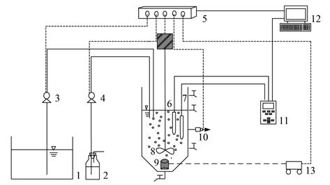 1. 水箱; 2. HCl溶液; 3. 蠕動泵; 4. 流量型蠕動泵; 5. pH控制系統; 6. pH探頭; 7. DO探頭; 8. 攪拌裝置; 9. 黏沙塊曝氣頭; 10. 電磁閥; 11. Multi 3420在線測定儀; 12. 計算機; 13. 空氣壓縮機